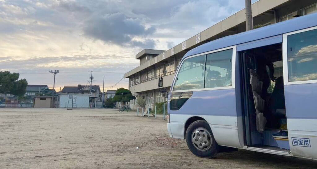 マイクロバスで学校へ向かいます。